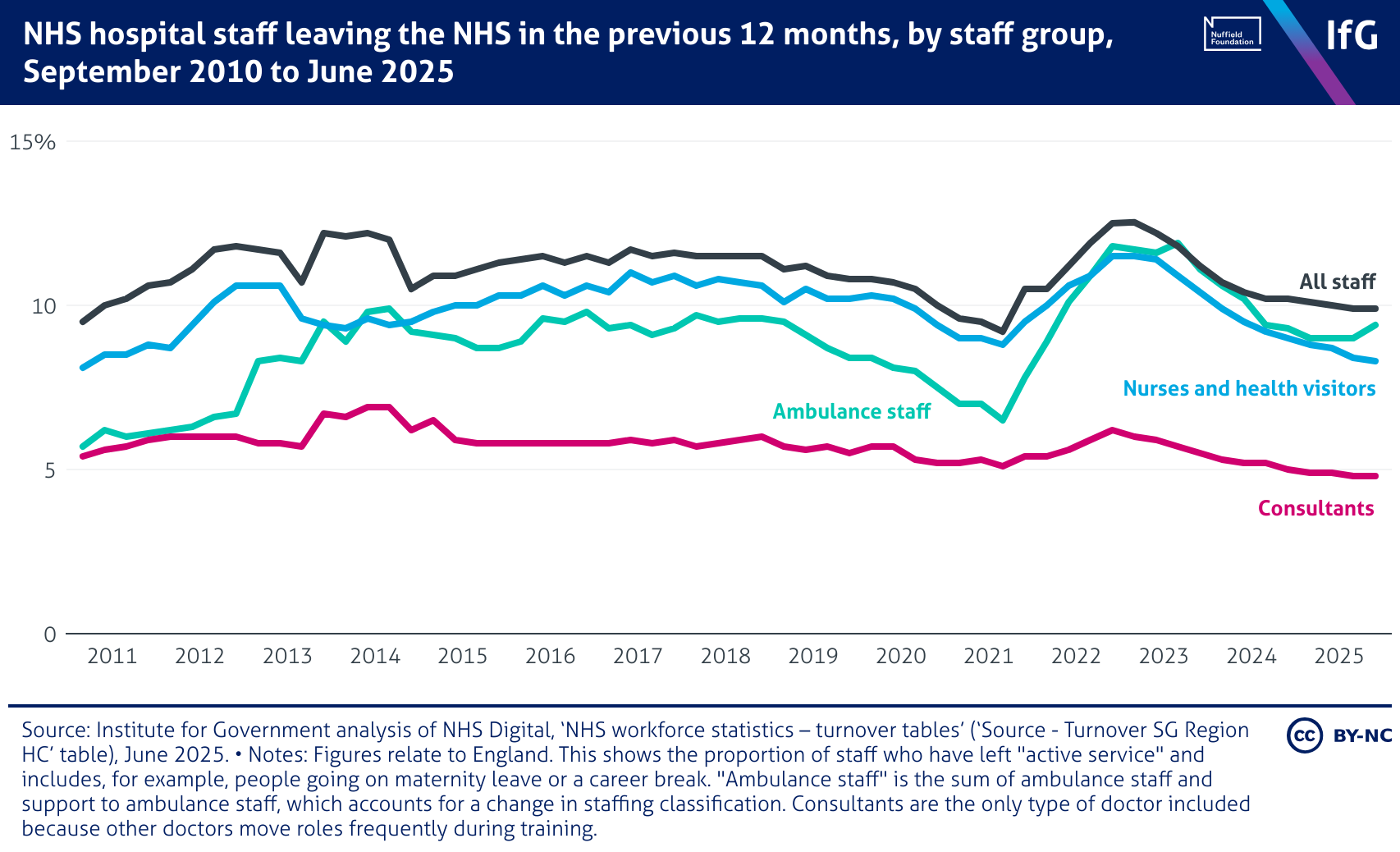 A line chart from the Institute for Government showing NHS hospital staff leaving the NHS in the previous 12 months, by staff group, September 2010 to June 2025. Turnover peaked in 2022, when over 12% of all staff and 11% of nurses and ambulance workers left the NHS. Since then, exit rates have fallen across all groups, with consultant departures remaining consistently low at around 5%.