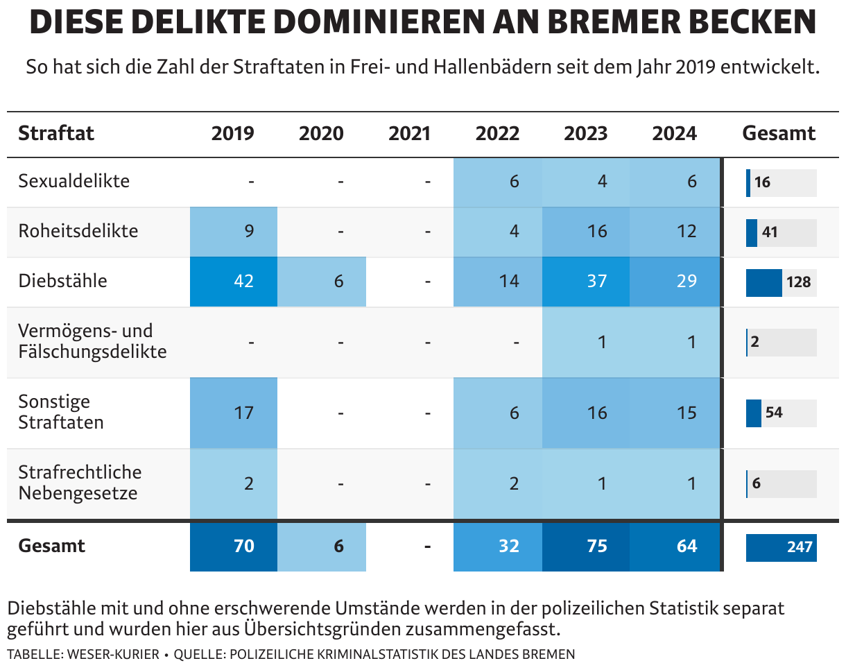 So hat sich die Zahl der Straftaten in Frei- und Hallenbädern seit dem Jahr 2019 entwickelt.