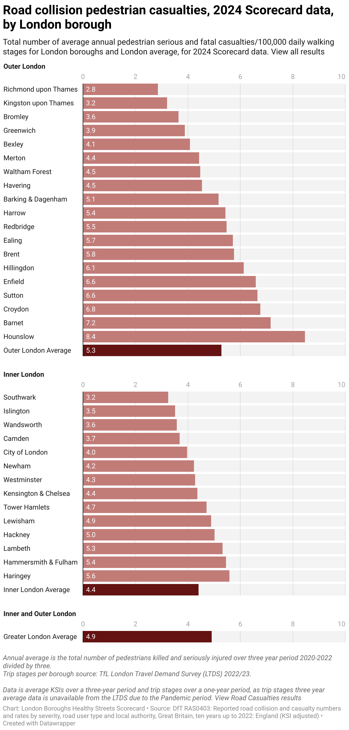 Total number of average annual pedestrian serious and fatal casualties/100,000 daily walking stages for London boroughs and London average, for 2024 Scorecard data. View all results