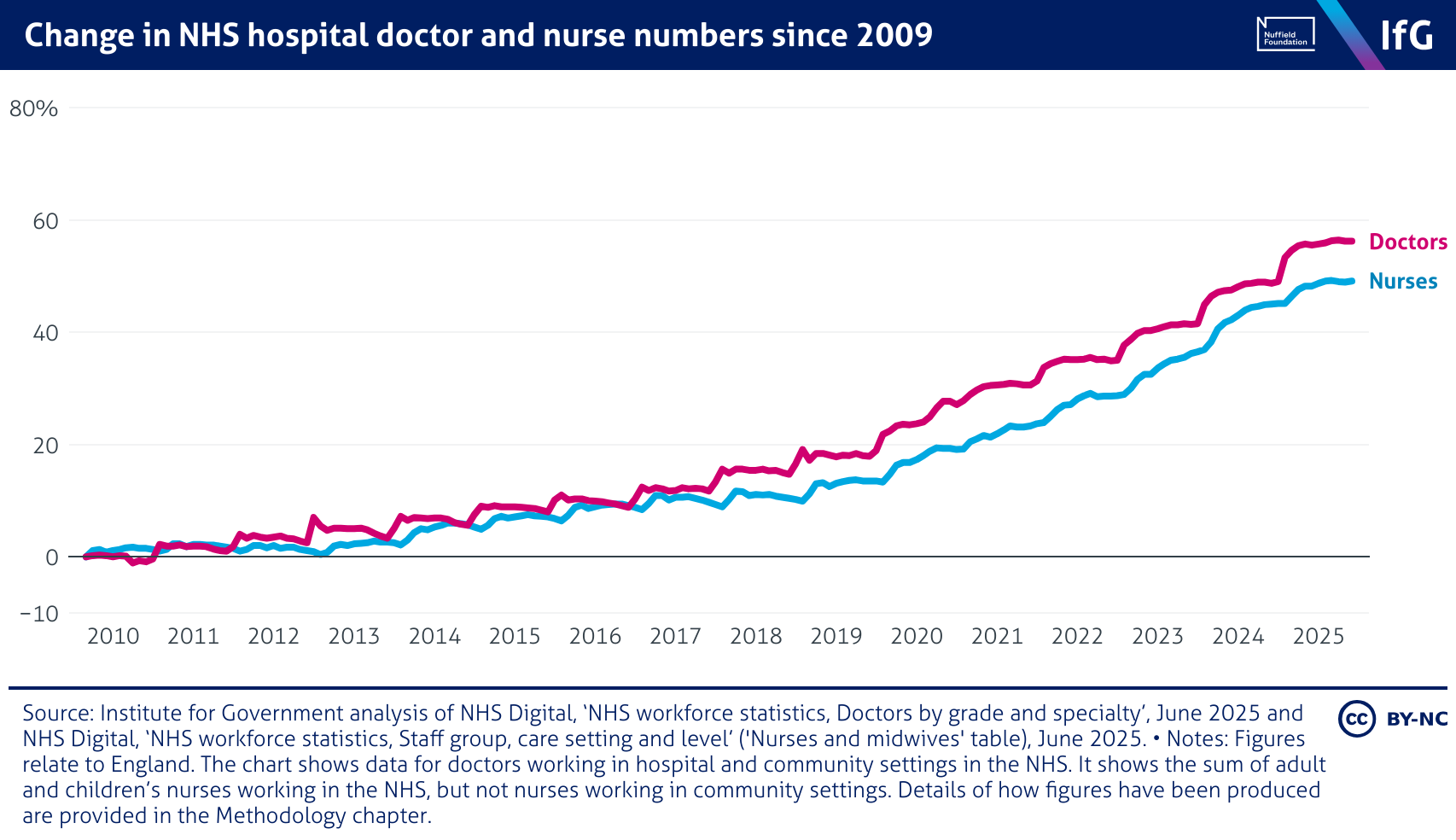 A line chart from the Institute for Government showing Change in NHS hospital doctor and nurse numbers since 2009. Both professions have seen steady growth, with doctor numbers rising by around 56% and nurses by 49% by mid-2025. Growth accelerated after 2018, though the gap between doctors and nurses has widened slightly in recent years.