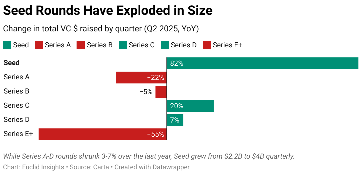 Change in total VC $ raised by quarter (Q2 2025, YoY)