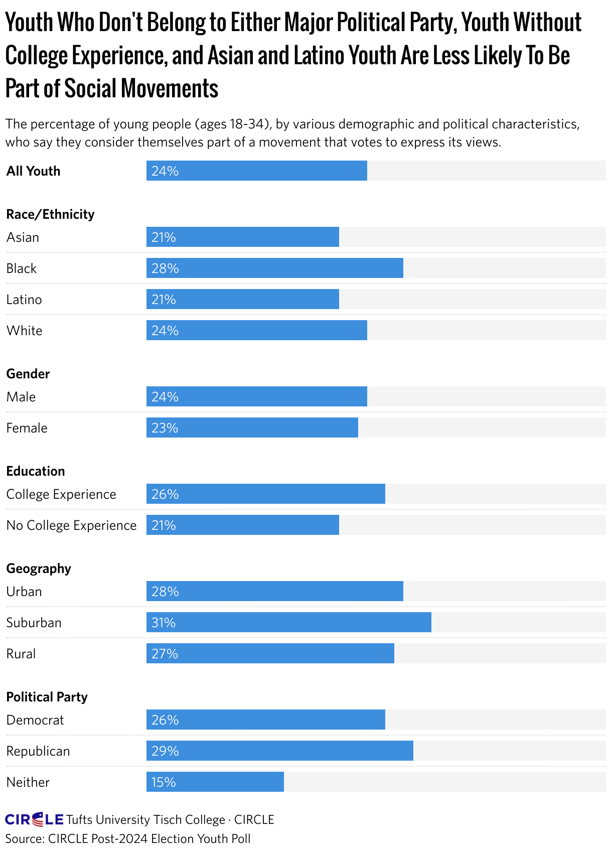 Youth Who Don't Belong to Either Major Political Party, Youth Without College Experience, and Asian and Latino Youth Are Less Likely To Be Part of Social Movements