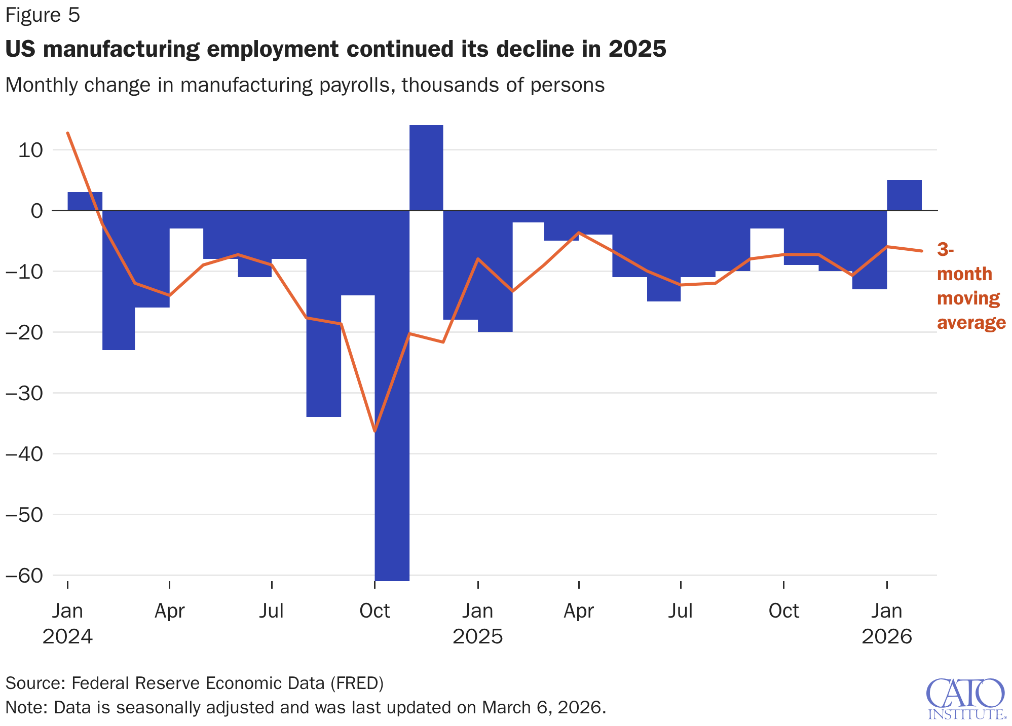 Monthly change in manufacturing payrolls, thousands of persons