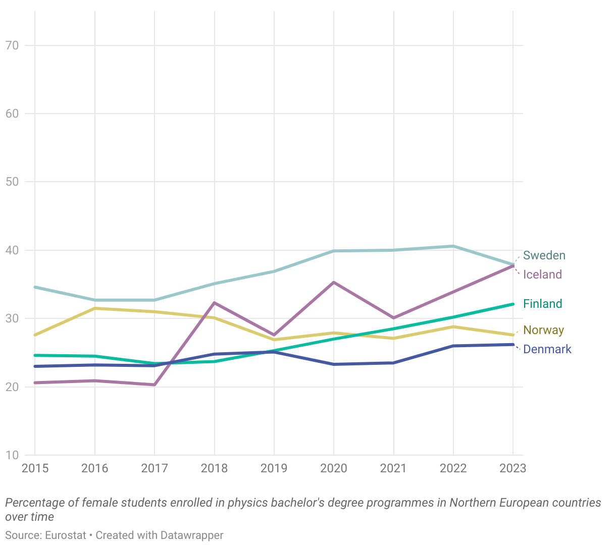 Percentage of female students enrolled in physics bachelor's degree programmes in Northern European countries over time