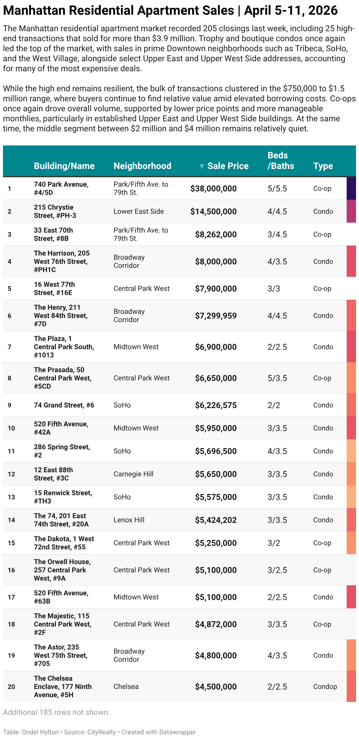 The Manhattan residential apartment market recorded 205 closings last week, including 25 high-end transactions that sold for more than $3.9 million. Trophy and boutique condos once again led the top of the market, with sales in prime Downtown neighborhoods such as Tribeca, SoHo, and the West Village, alongside select Upper East and Upper West Side addresses, accounting for many of the most expensive deals.