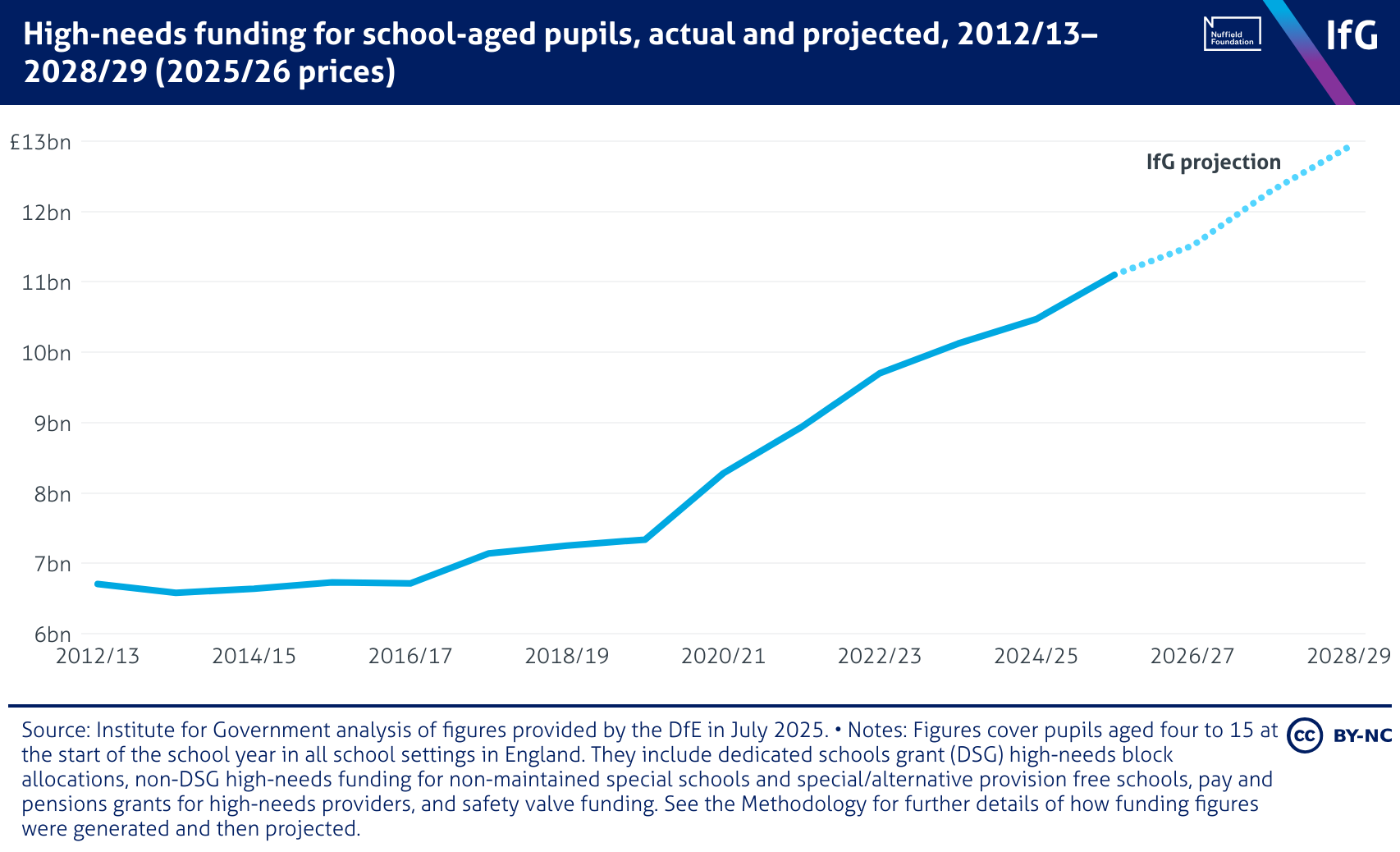 A line chart from the Institute for Government of high-needs funding for school-aged pupils, actual and projected, 2012/13–2028/29 (2025/26 prices), where it has grown by two thirds from £6.7bn to £11.1bn between 2012/13 and 2025/26. The IfG forecasts it will hit £12.9bn by 2028/29, up 93% on 2012/13.