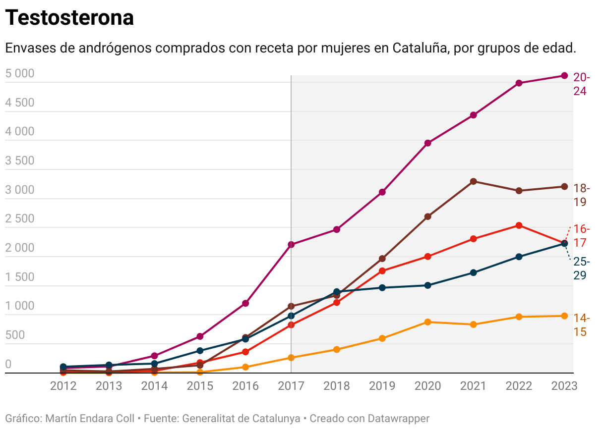 Envases de andrógenos comprados con receta por mujeres en Cataluña, por grupos de edad.