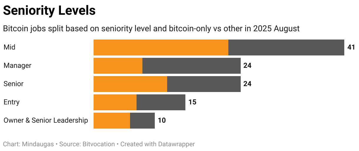Bitcoin jobs split based on seniority level and bitcoin-only vs other in 2025 August