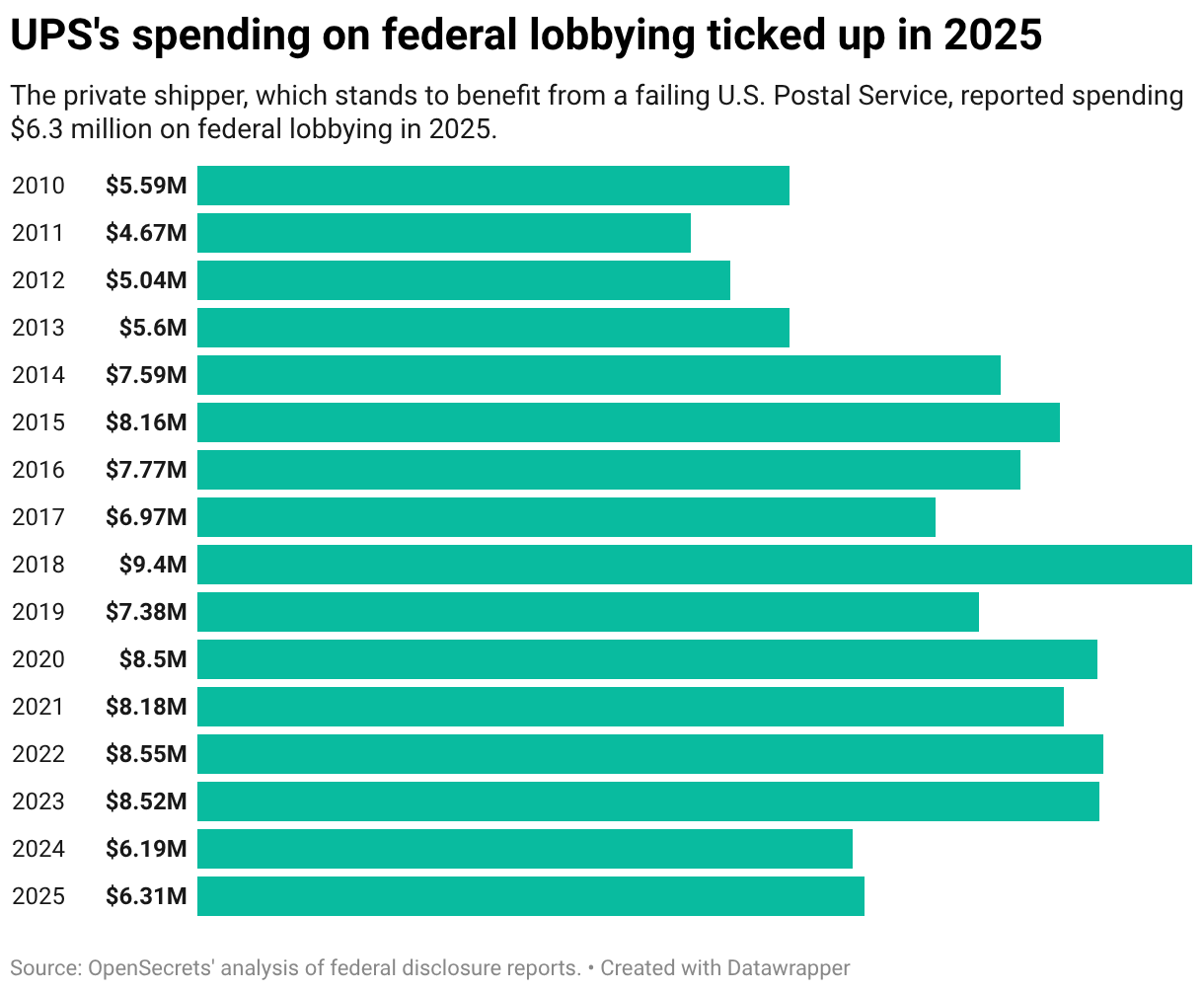 The private shipper, which stands to benefit from a failing U.S. Postal Service, reported spending $6.3 million on federal lobbying in 2025.
