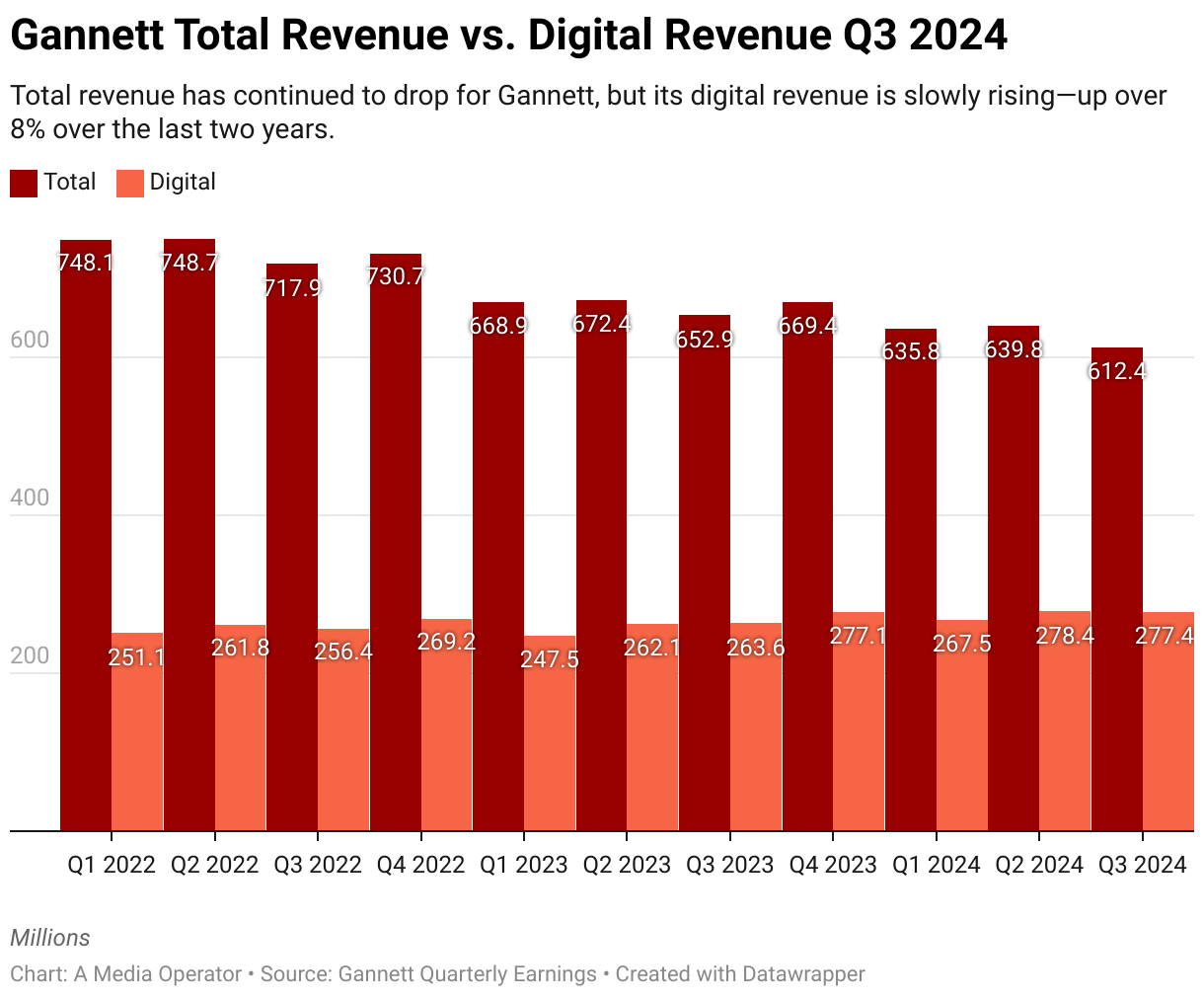 Total revenue has continued to drop for Gannett, but its digital revenue is slowly rising—up over 8% over the last two years.