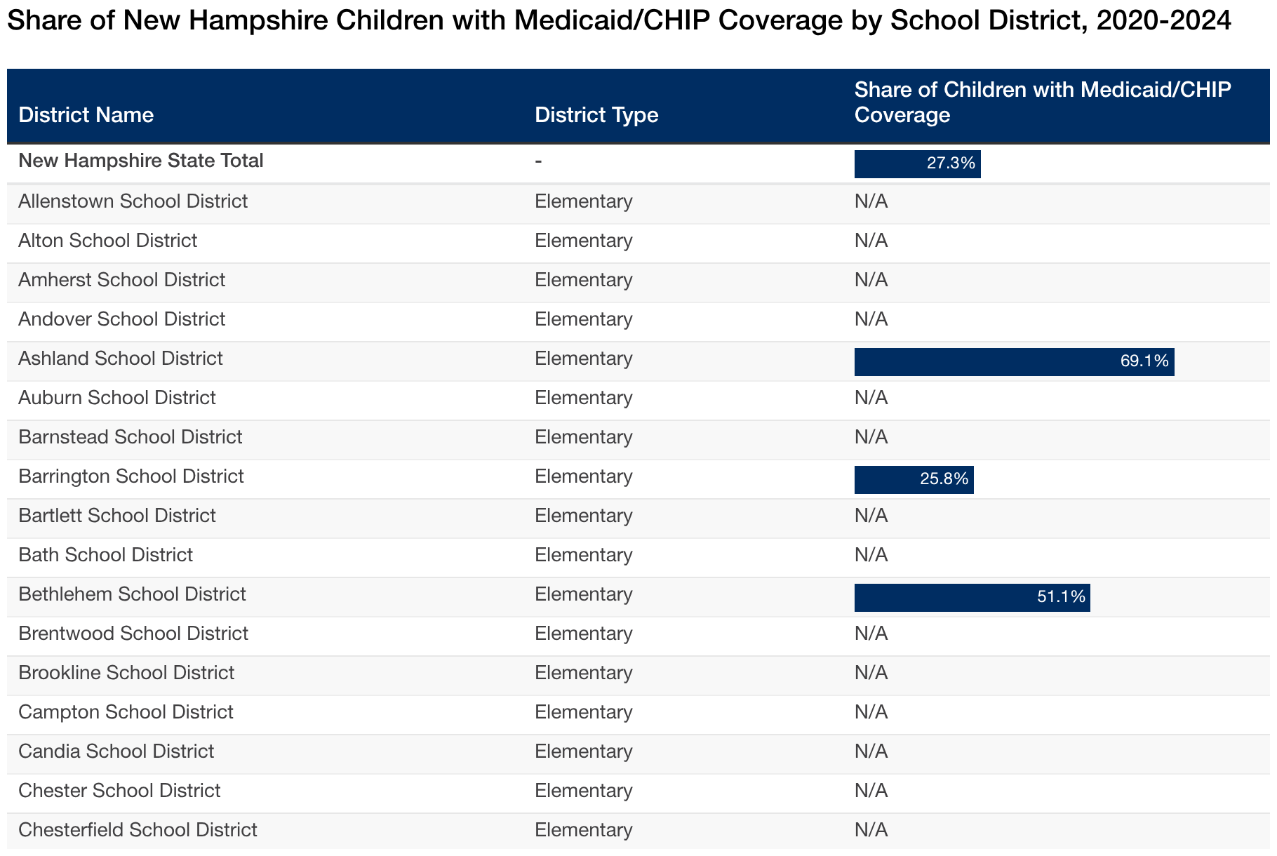 Share of New Hampshire Children with Medicaid/CHIP Coverage by School District, 2020-2024