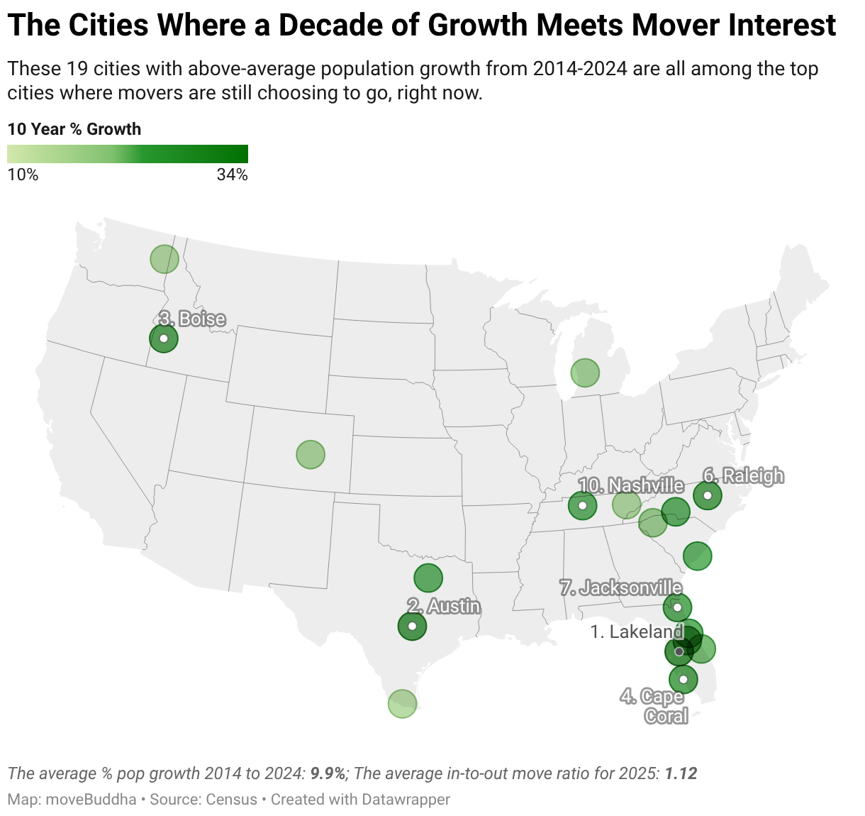These 19 cities with above-average population growth from 2014-2024 are all among the top cities where movers are still choosing to go, right now.