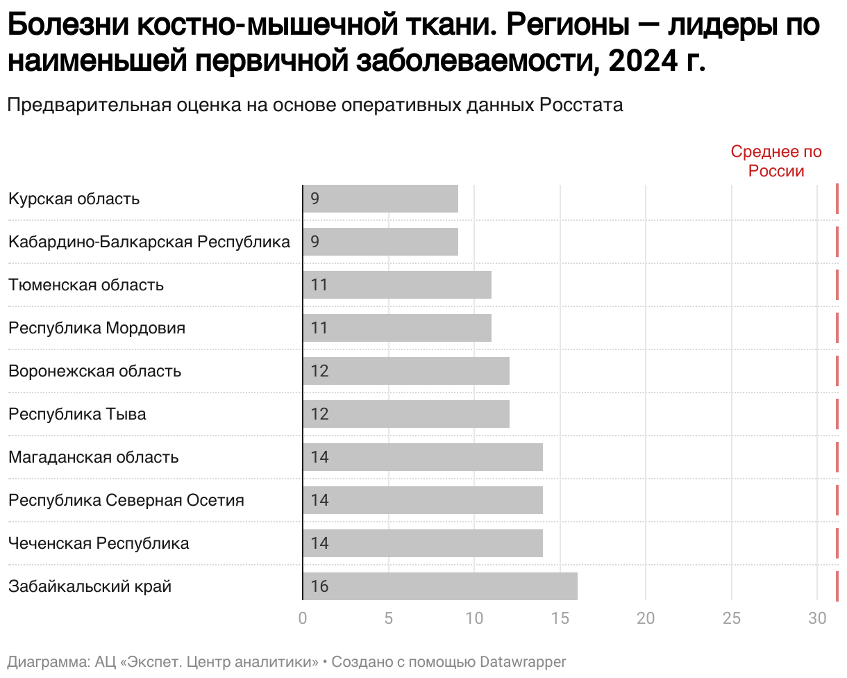 Болезни костно-мышечной ткани. Регионы — лидеры по наименьшей первичной заболеваемости, 2024 г.