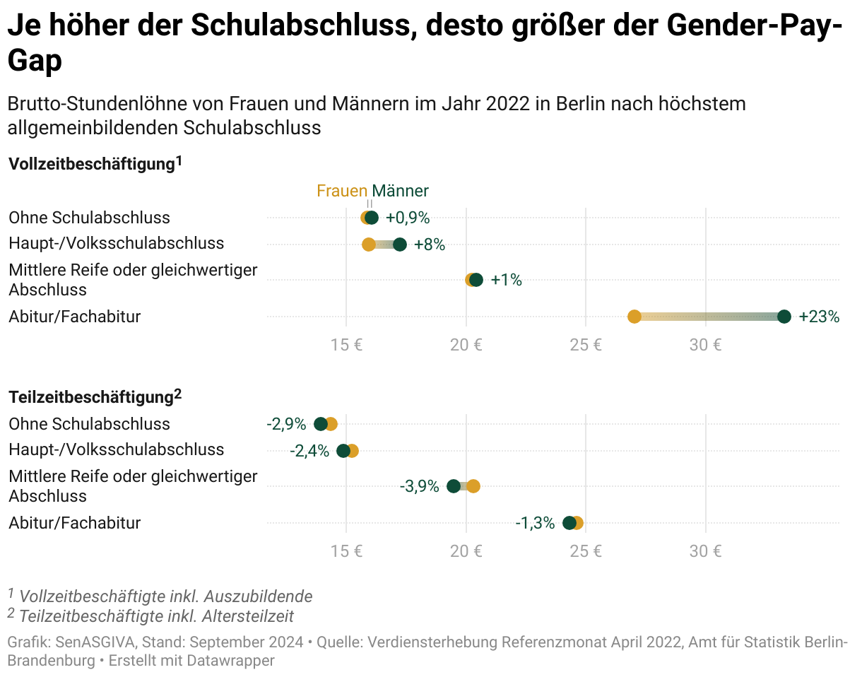 Die höchste Verdienstlücke zwischen Frauen und Männern klafft zwischen (Fach )Abiturientinnen bzw. Abiturienten mit einer Vollzeitbeschäftigung: Mit einem durchschnittlichen Brutto-Stundenlohn von 33,33 Euro verdienen die Berliner Männer mit Abitur oder Fachabitur satte 23 Prozent mehr als die Berlinerinnen mit dem gleichen Schulabschluss. Sie verdienen im Schnitt nur 27,07 Euro brutto pro Stunde.