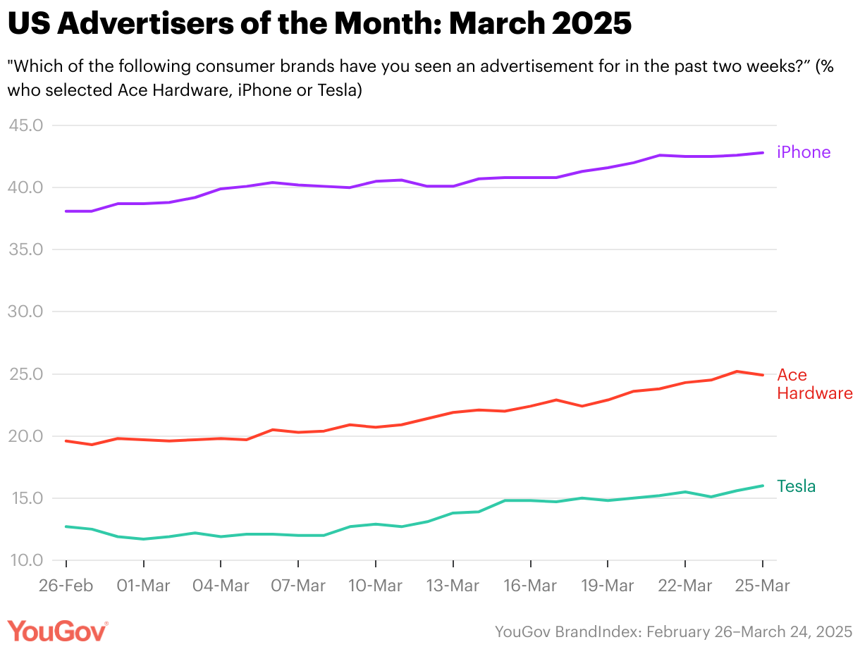 "Which of the following consumer brands have you seen an advertisement for in the past two weeks?” (% who selected Ace Hardware, iPhone or Tesla)
