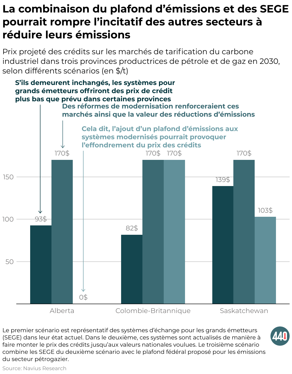 La figure montre que le prix des crédits en Alberta serait à 93$ la tonne en 2030 dans un scénario des politiques actuelles, 170$ la tonne avec la modernisation des systèmes d'échanges pour les grands émetteurs, et 0$ la tonne avec l'ajout d'un plafond d'émissions du secteur pétrogazier. Le prix en Colombie-Britannique serait 82$ dans le premier scénario et 170$ dans le deuxième et troisème. En Saskatchewan, le prix serait 139$ dans le premier scénario, 170$ dans le deuxième, et 103$ dans le troisième.