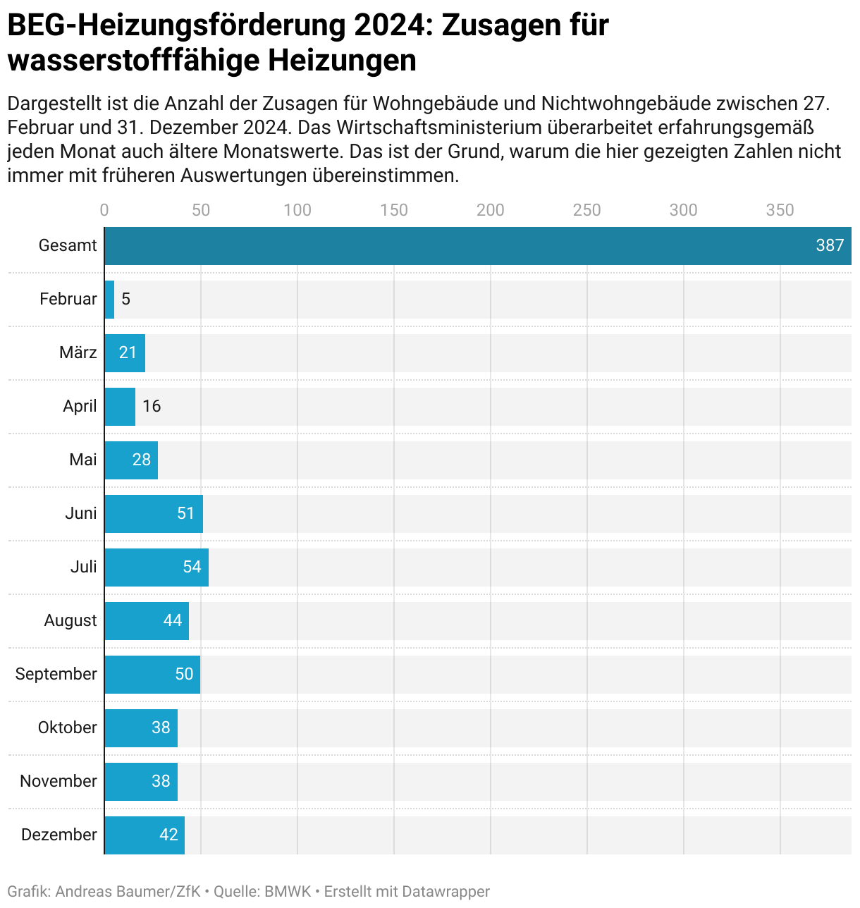 Dargestellt ist die Anzahl der Zusagen für Wohngebäude und Nichtwohngebäude zwischen 27. Februar und 31. Dezember 2024. Das Wirtschaftsministerium überarbeitet erfahrungsgemäß jeden Monat auch ältere Monatswerte. Das ist der Grund, warum die hier gezeigten Zahlen nicht immer mit früheren Auswertungen übereinstimmen.