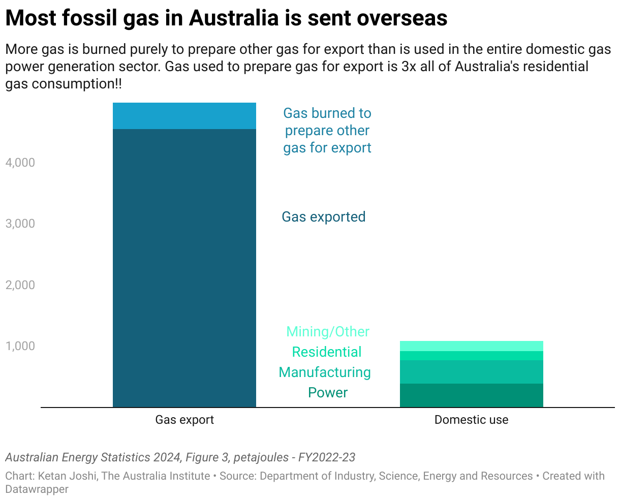 More gas is burned purely to prepare other gas for export than is used in the entire domestic gas power generation sector. Gas used to prepare gas for export is 3x all of Australia's residential gas consumption!!