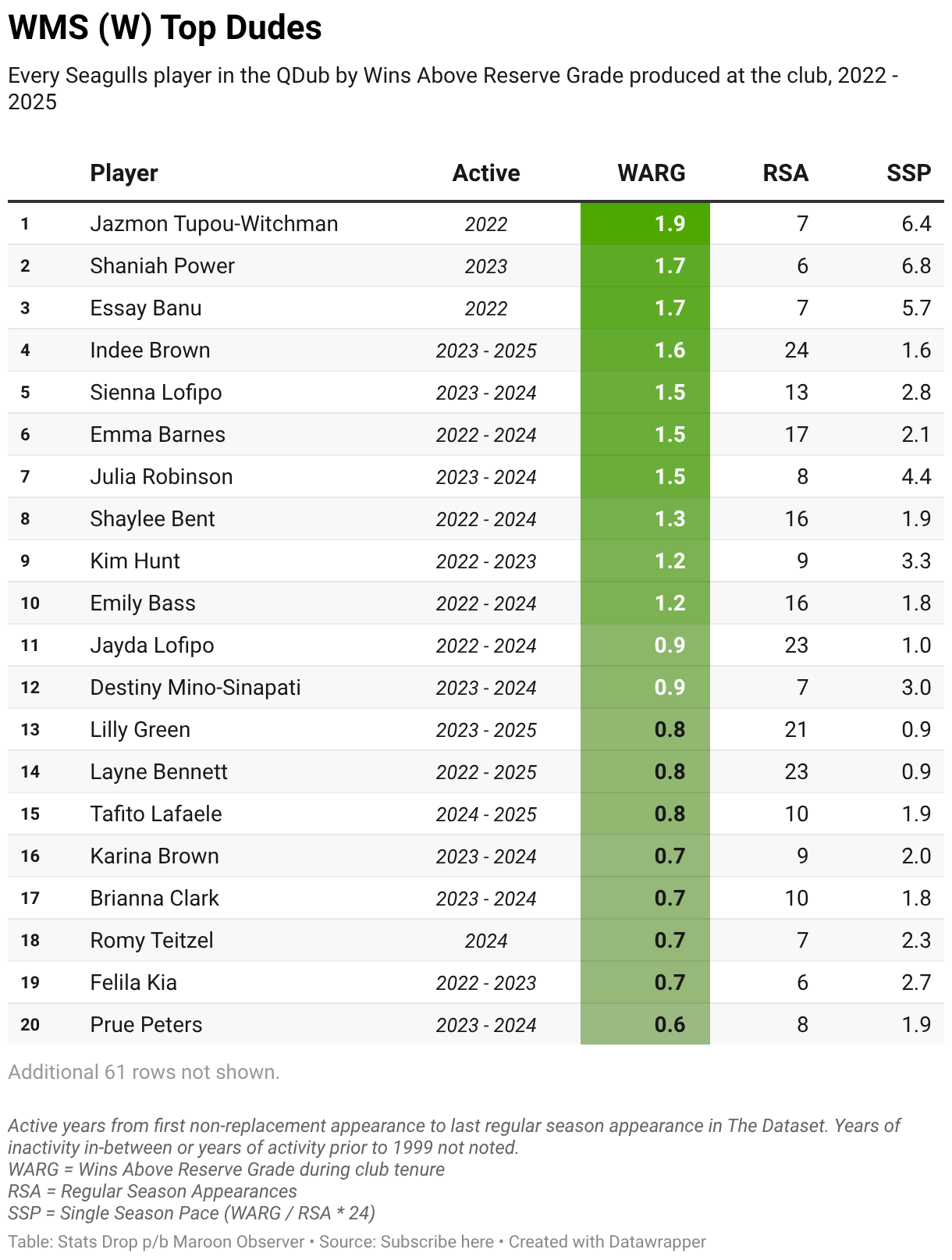 Every Seagulls player in the QDub by Wins Above Reserve Grade produced at the club, 2022 - 2025
