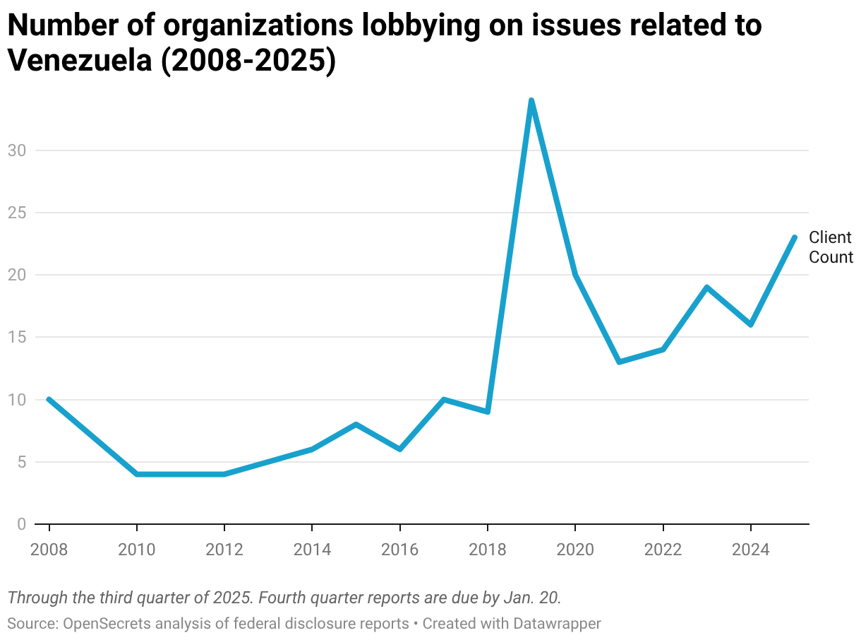 Number of organizations lobbying on issues related to Venezuela (2008-2025)