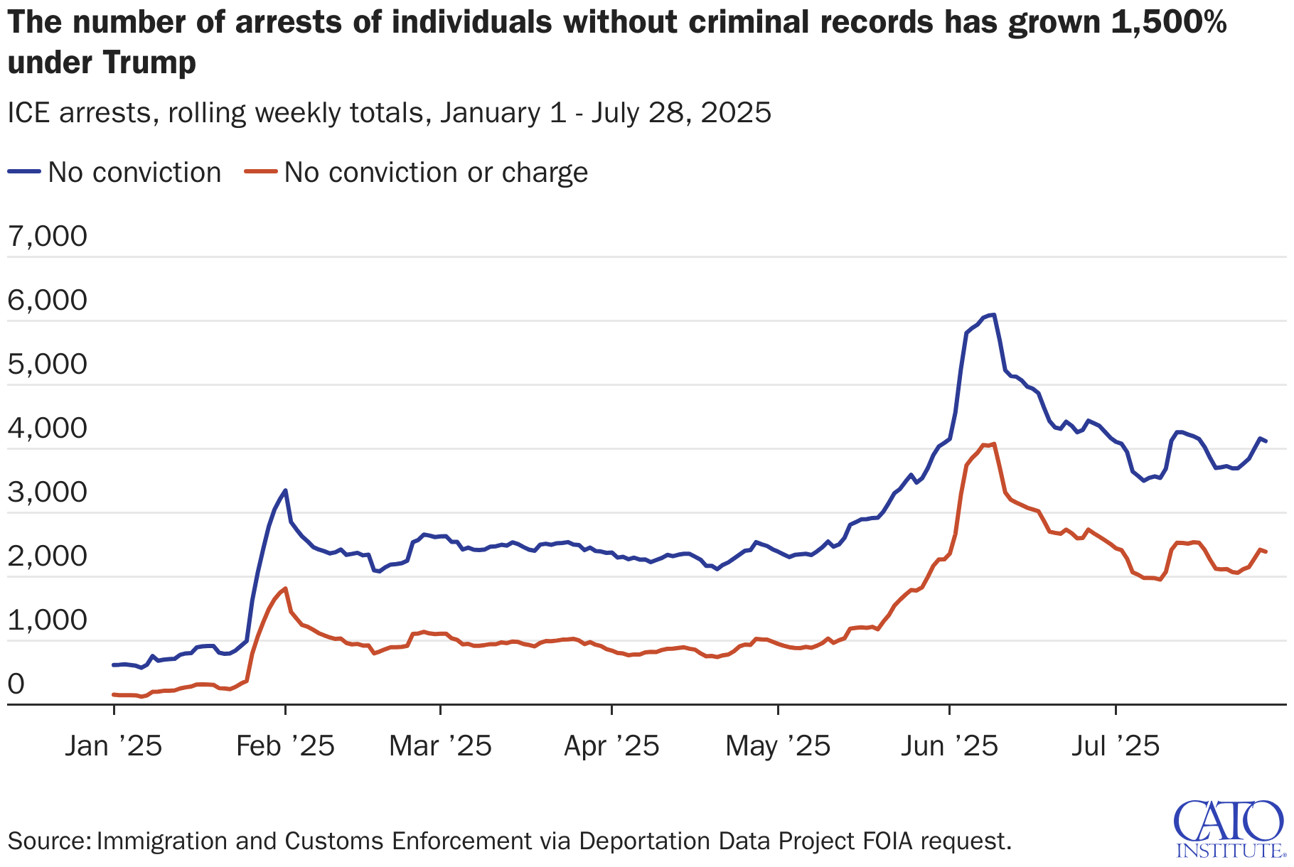 ICE arrests, rolling weekly totals, January 1 - July 28, 2025