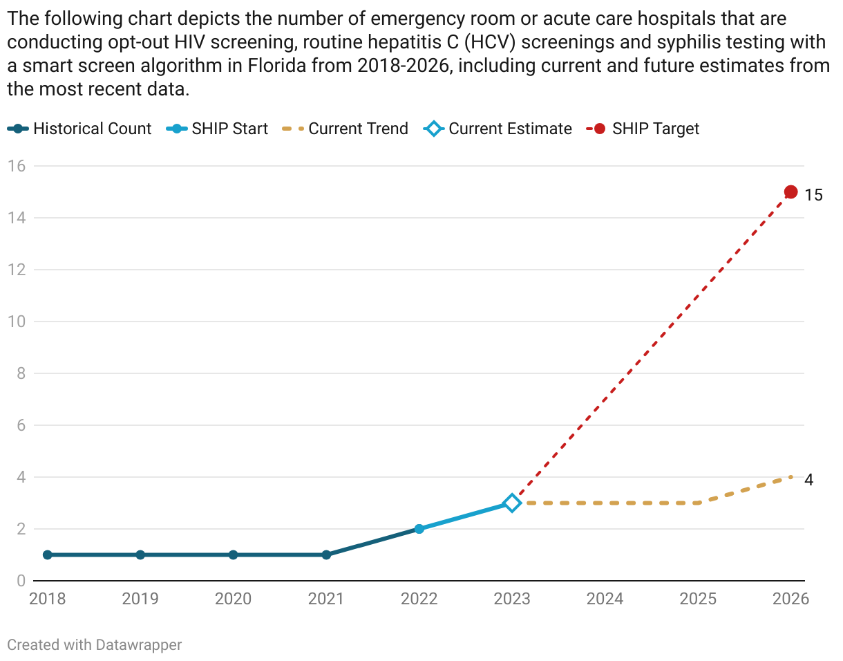 The following chart depicts the number of emergency room or acute care hospitals that are conducting opt-out HIV screening, routine hepatitis C (HCV) screenings and syphilis testing with a smart screen algorithm in Florida from 2018-2026, including current and future estimates from the most recent data.