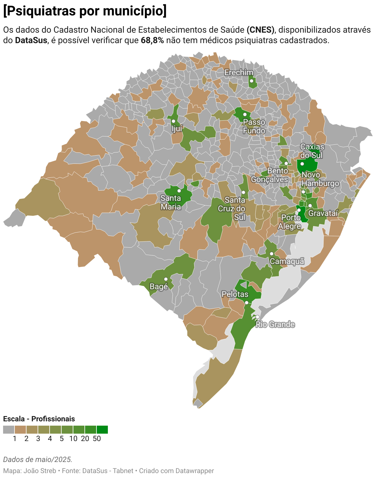 Os dados do Cadastro Nacional de Estabelecimentos de Saúde (CNES), disponibilizados através do DataSus, é possível verificar que 68,8% não tem médicos psiquiatras cadastrados.