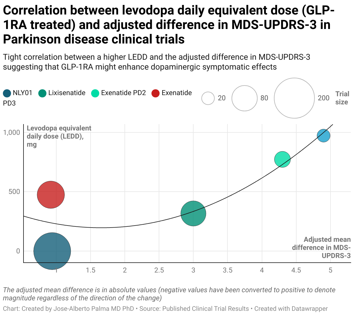 Tight correlation between a higher LEDD and the adjusted difference in MDS-UPDRS-3 suggesting that GLP-1RA might enhance dopaminergic symptomatic effects