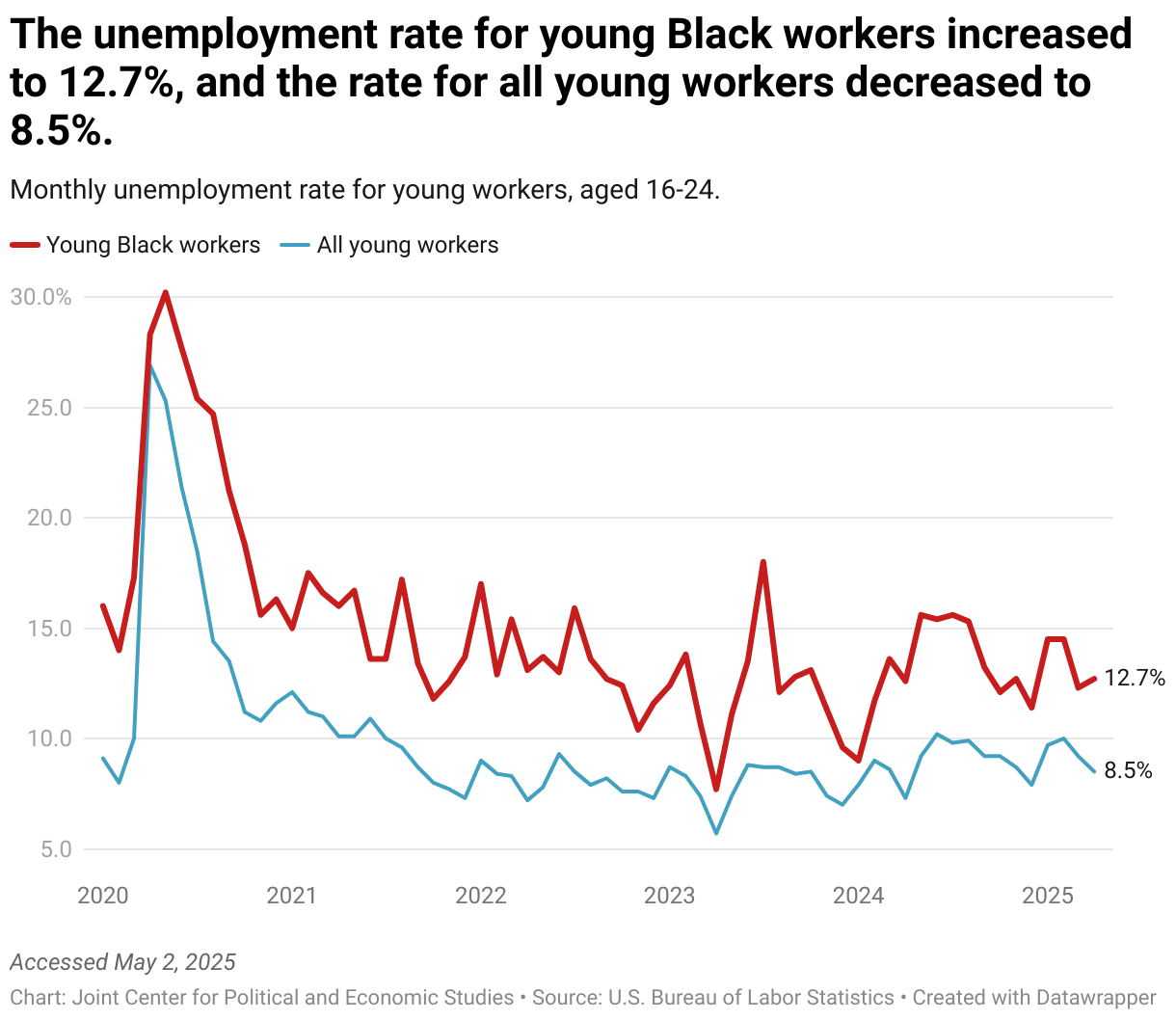 Monthly unemployment rate for young workers, aged 16-24.