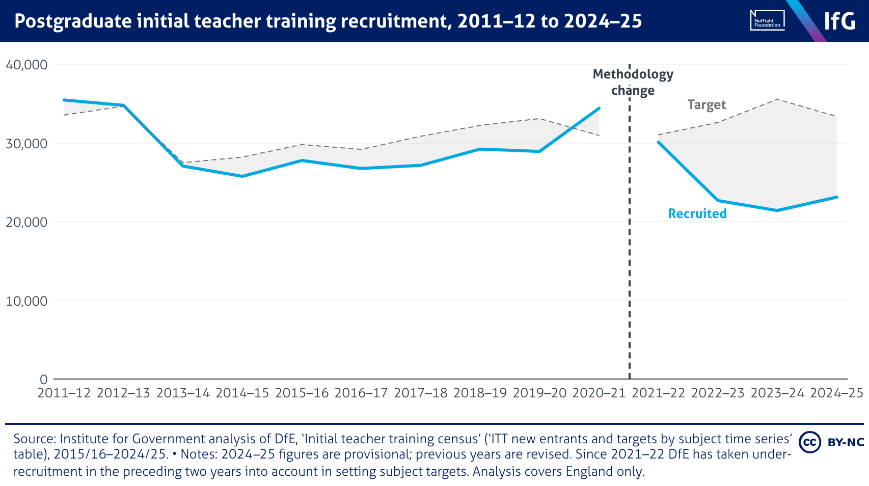 A line chart from the Institute for Government showing postgraduate initial teacher training recruitment, 2011–12 to 2024–25. Trainee numbers have been below the target in each year bar 2019/20, and the gap was at its largest in 2023–24, before narrowing slightly in 2024–25.