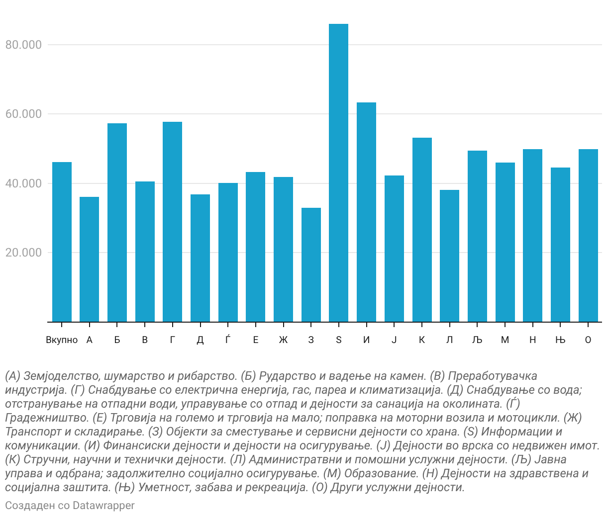 (А) Земјоделство, шумарство и рибарство. (Б) Рударство и вадење на камен. (В) Преработувачка индустрија. (Г) Снабдување со електрична енергија, гас, пареа и климатизација. (Д) Снабдување со вода; отстранување на отпадни води, управување со отпад и дејности за санација на околината. (Ѓ) Градежништво. (Е) Трговија на големо и трговија на мало; поправка на моторни возила и мотоцикли. (Ж) Транспорт и складирање. (З) Објекти за сместување и сервисни дејности со храна. (Ѕ) Информации и комуникации. (И) Финансиски дејности и дејности на осигурување. (Ј) Дејности во врска со недвижен имот. (К) Стручни, научни и технички дејности. (Л) Администратвни и помошни услужни дејности. (Љ) Јавна управа и одбрана; задолжително социјално осигурување. (М) Образование. (Н) Дејности на здравствена и социјална заштита. (Њ) Уметност, забава и рекреација. (О) Други услужни дејности.