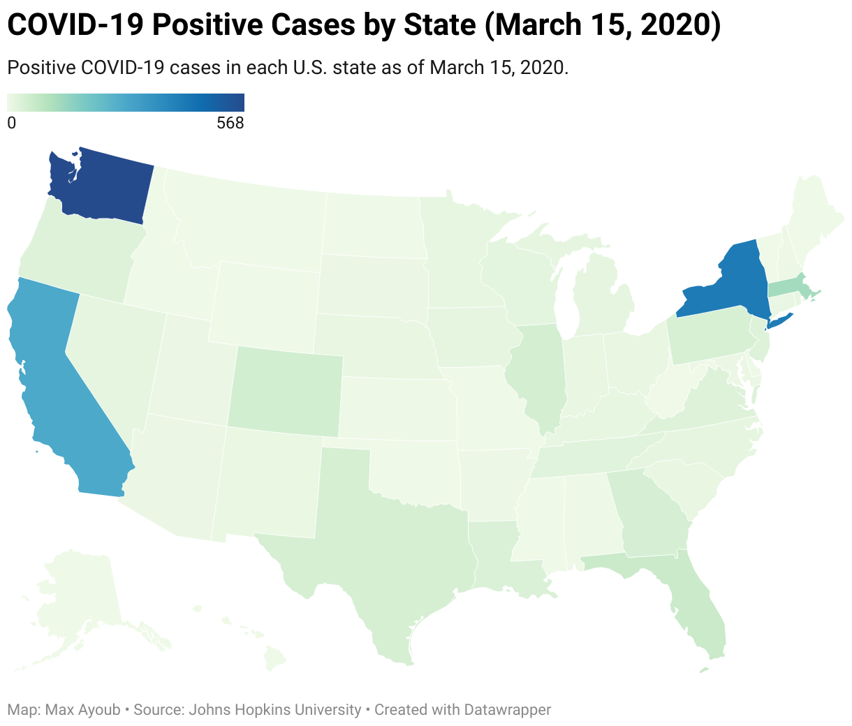 Positive COVID-19 cases in each U.S. state as of March 15, 2020.