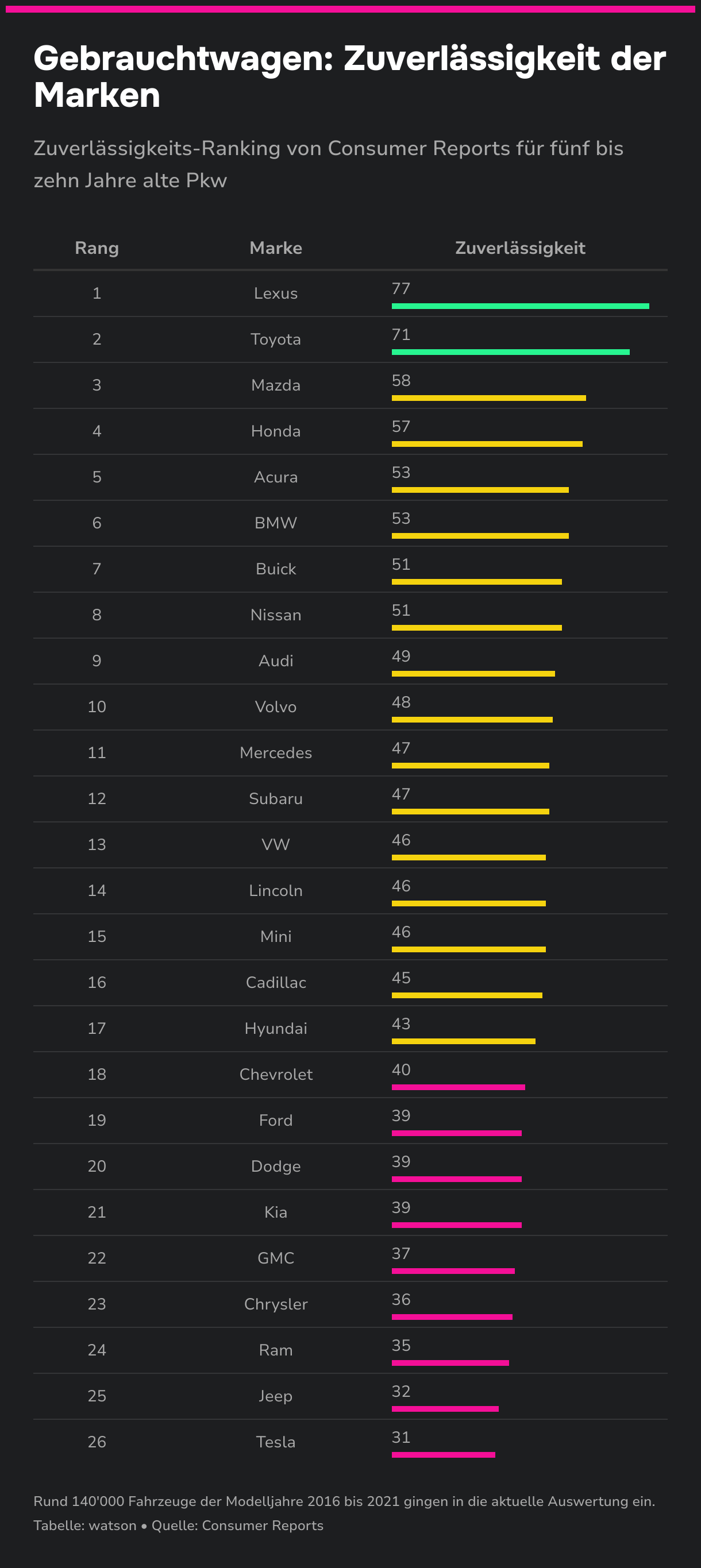 Zuverlässigkeits-Ranking von Consumer Reports für fünf bis zehn Jahre alte Pkw