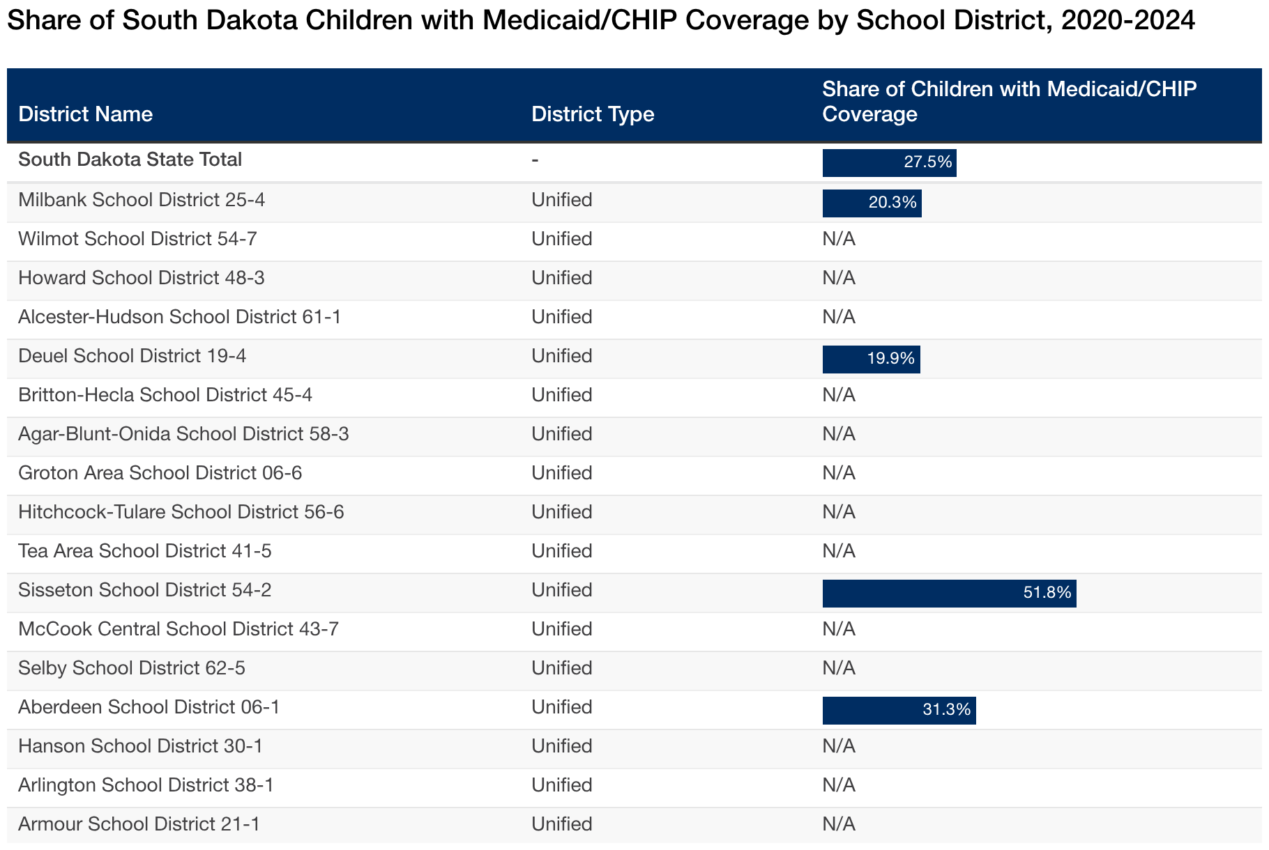 Share of South Dakota Children with Medicaid/CHIP Coverage by School District, 2020-2024