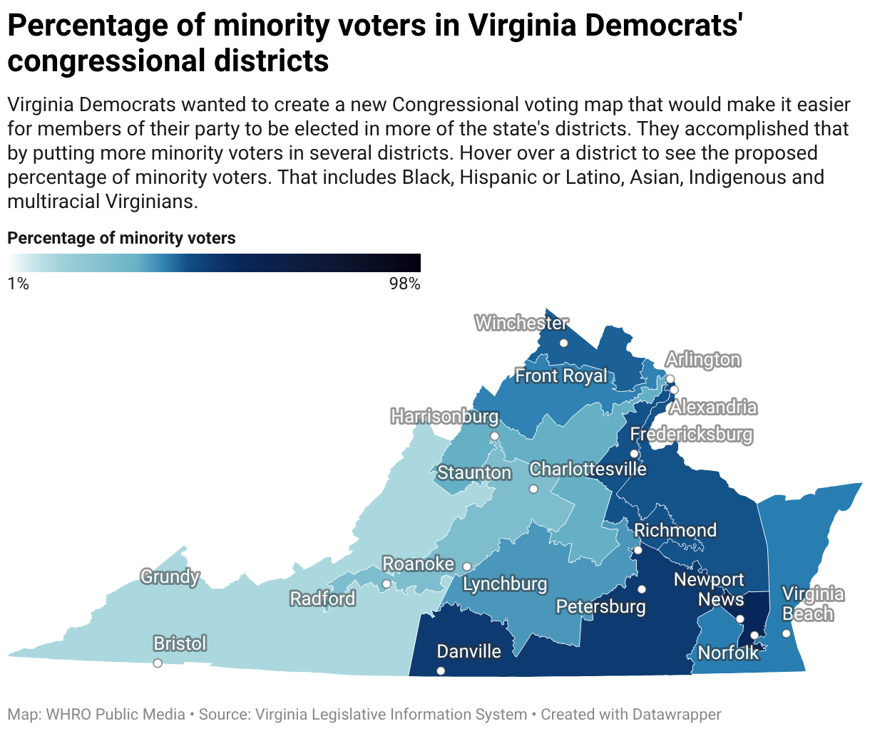 Virginia Democrats wanted to create a new Congressional voting map that would make it easier for members of their party to be elected in more of the state's districts. They accomplished that by putting more minority voters in several districts. Hover over a district to see the proposed percentage of minority voters. That includes Black, Hispanic or Latino, Asian, Indigenous and multiracial Virginians.