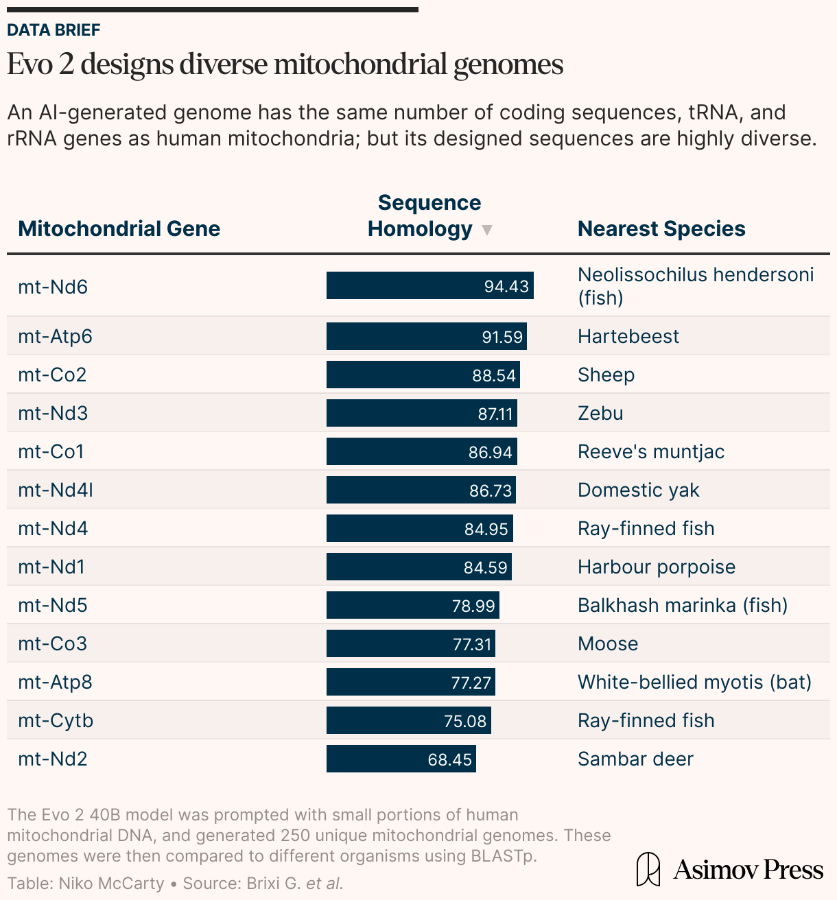 An AI-generated genome has the same number of coding sequences, tRNA, and rRNA genes as human mitochondria; but its designed sequences are highly diverse.