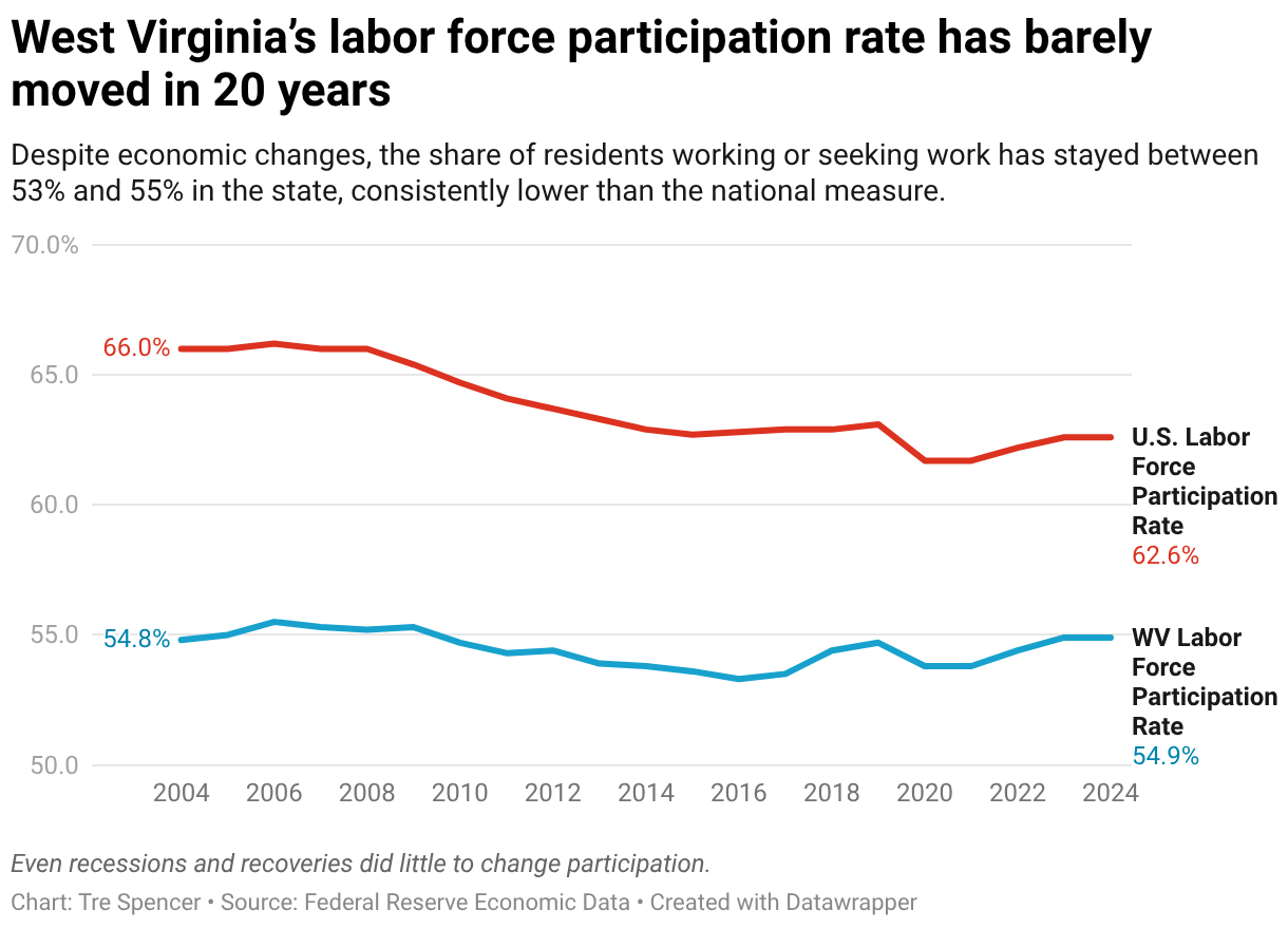 Despite economic changes, the share of residents working or seeking work has stayed between 53% and 55% in the state, consistently lower than the national measure.