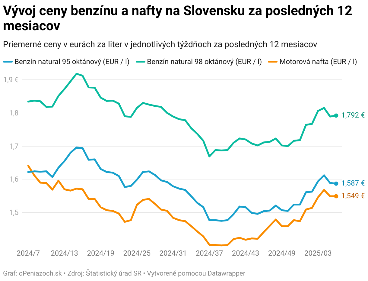 Priemerné ceny v eurách za liter v jednotlivých týždňoch za posledných 12 mesiacov