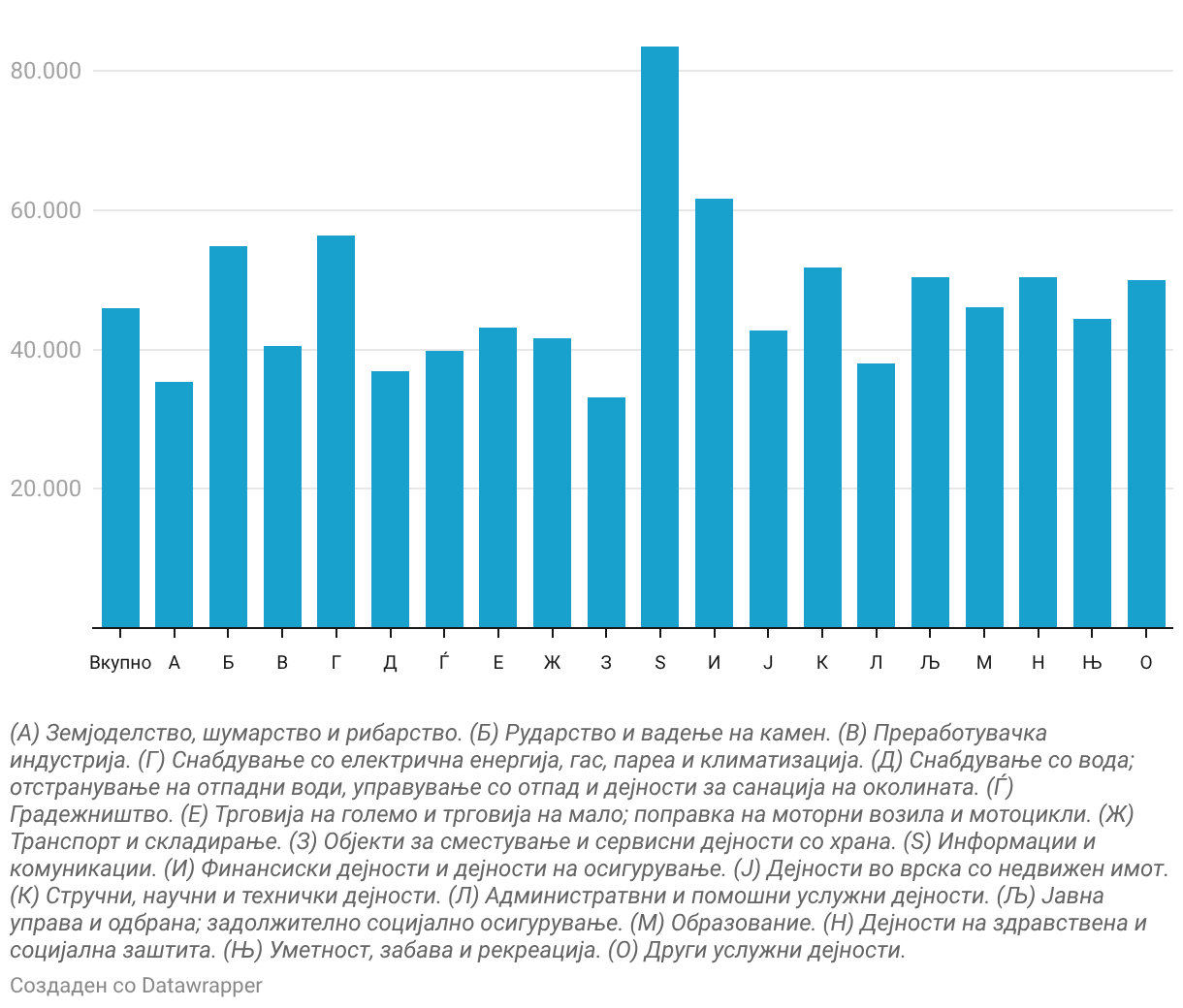 (А) Земјоделство, шумарство и рибарство. (Б) Рударство и вадење на камен. (В) Преработувачка индустрија. (Г) Снабдување со електрична енергија, гас, пареа и климатизација. (Д) Снабдување со вода; отстранување на отпадни води, управување со отпад и дејности за санација на околината. (Ѓ) Градежништво. (Е) Трговија на големо и трговија на мало; поправка на моторни возила и мотоцикли. (Ж) Транспорт и складирање. (З) Објекти за сместување и сервисни дејности со храна. (Ѕ) Информации и комуникации. (И) Финансиски дејности и дејности на осигурување. (Ј) Дејности во врска со недвижен имот. (К) Стручни, научни и технички дејности. (Л) Администратвни и помошни услужни дејности. (Љ) Јавна управа и одбрана; задолжително социјално осигурување. (М) Образование. (Н) Дејности на здравствена и социјална заштита. (Њ) Уметност, забава и рекреација. (О) Други услужни дејности.