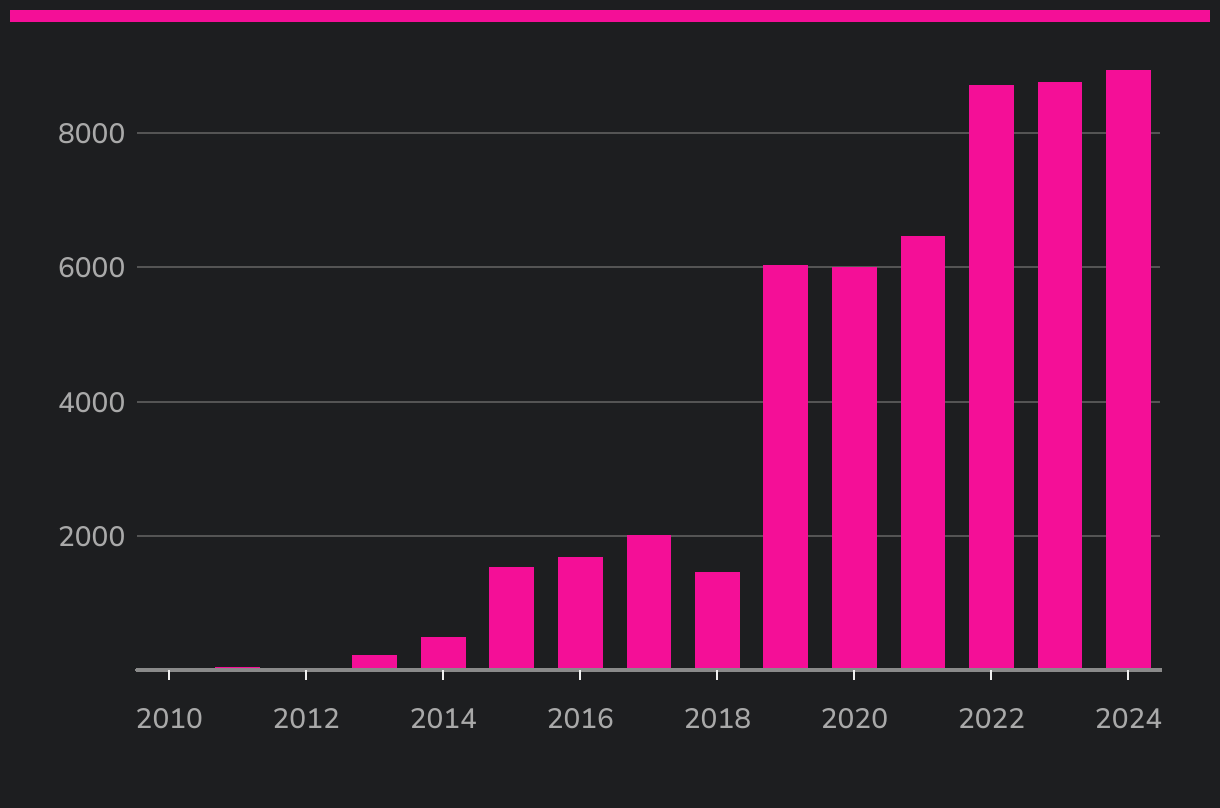 Anzahl Inverkehrssetzungen von Personenfahrzeugen der Marke Tesla in der Schweiz; 2010 bis 2024