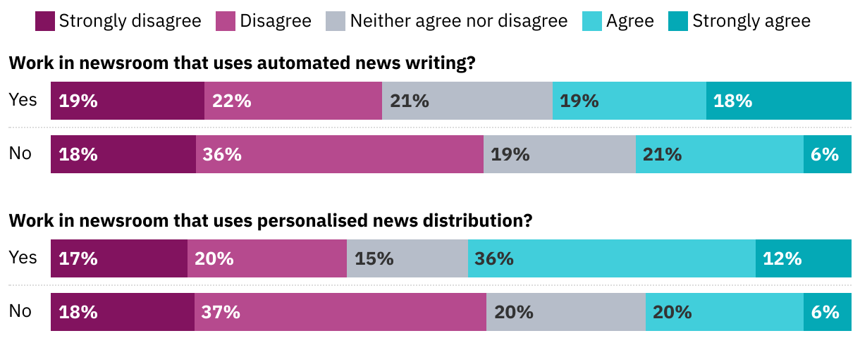Journalists who report working in newsrooms where automated news text production or personalised news distribution is used are more worried about losing their jobs.