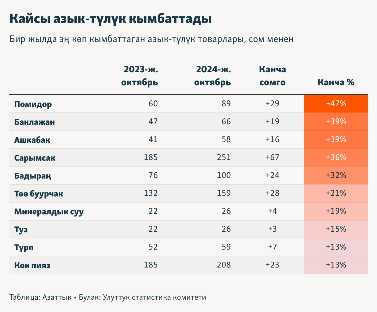 Бир жылда эң көп кымбаттаган азык-түлүк товарлары, сом менен