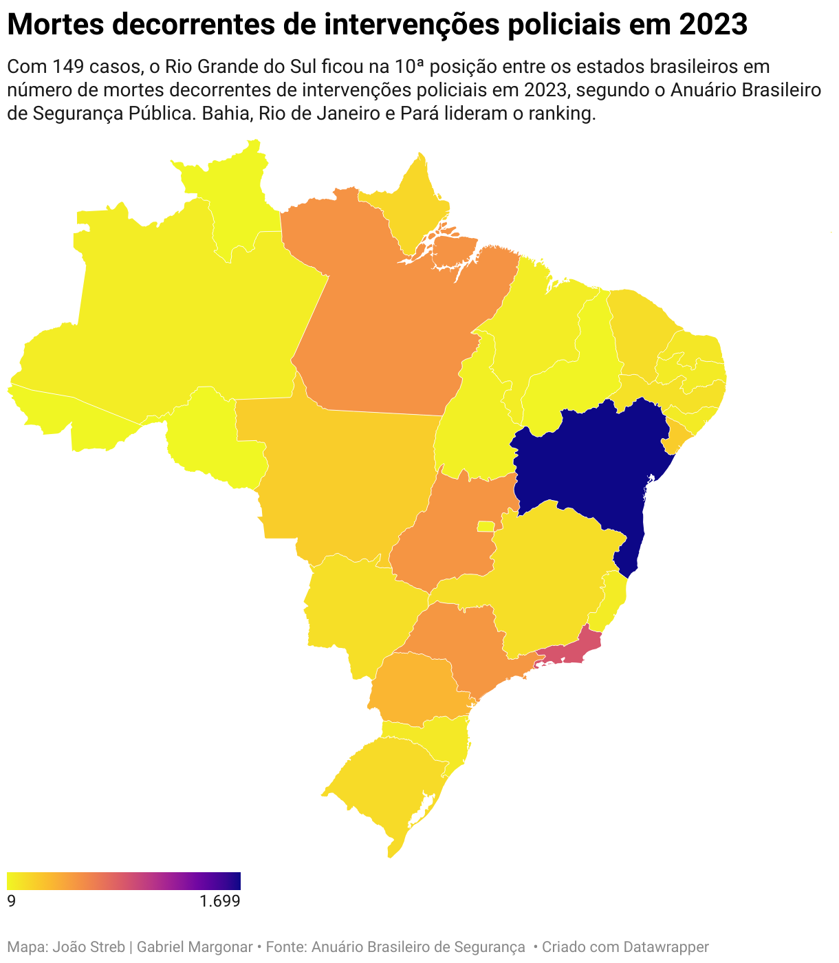 Com 149 casos, o Rio Grande do Sul ficou na 10ª posição entre os estados brasileiros em número de mortes decorrentes de intervenções policiais em 2023, segundo o Anuário Brasileiro de Segurança Pública. Bahia, Rio de Janeiro e Pará lideram o ranking.