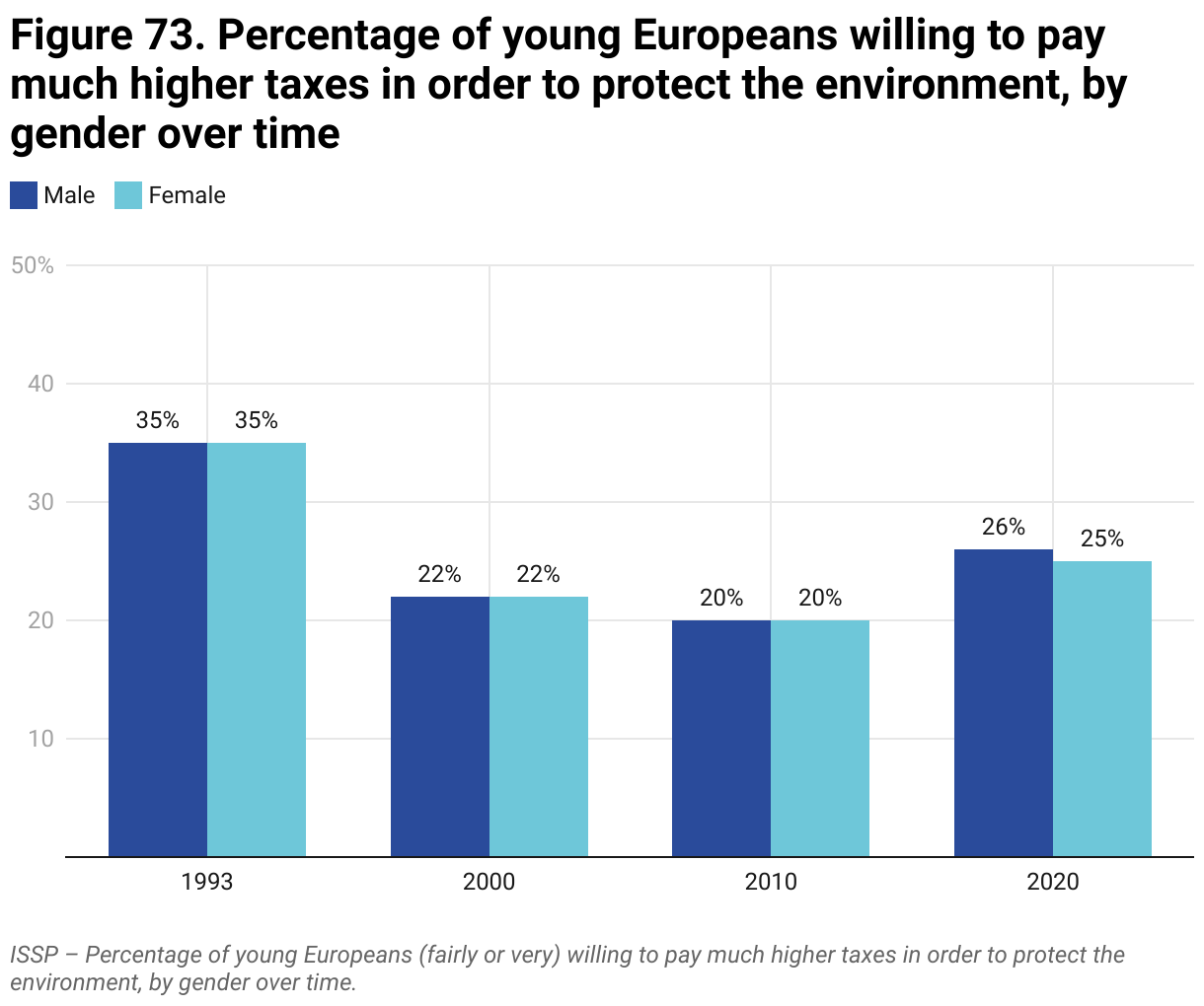 Figure 73. ISSP – Percentage of young Europeans (fairly or very) willing to pay much higher taxes in order to protect the environment, by gender over time.