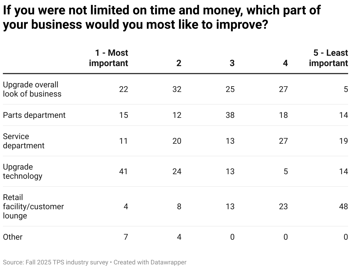 How aftermarket responders would like to invest in their business according to a November 2025 TPS reader survey.