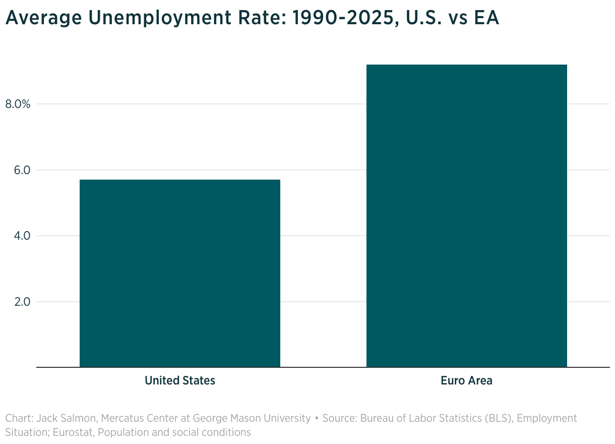 Average Unemployment Rate: 1990-2025, U.S. vs EA