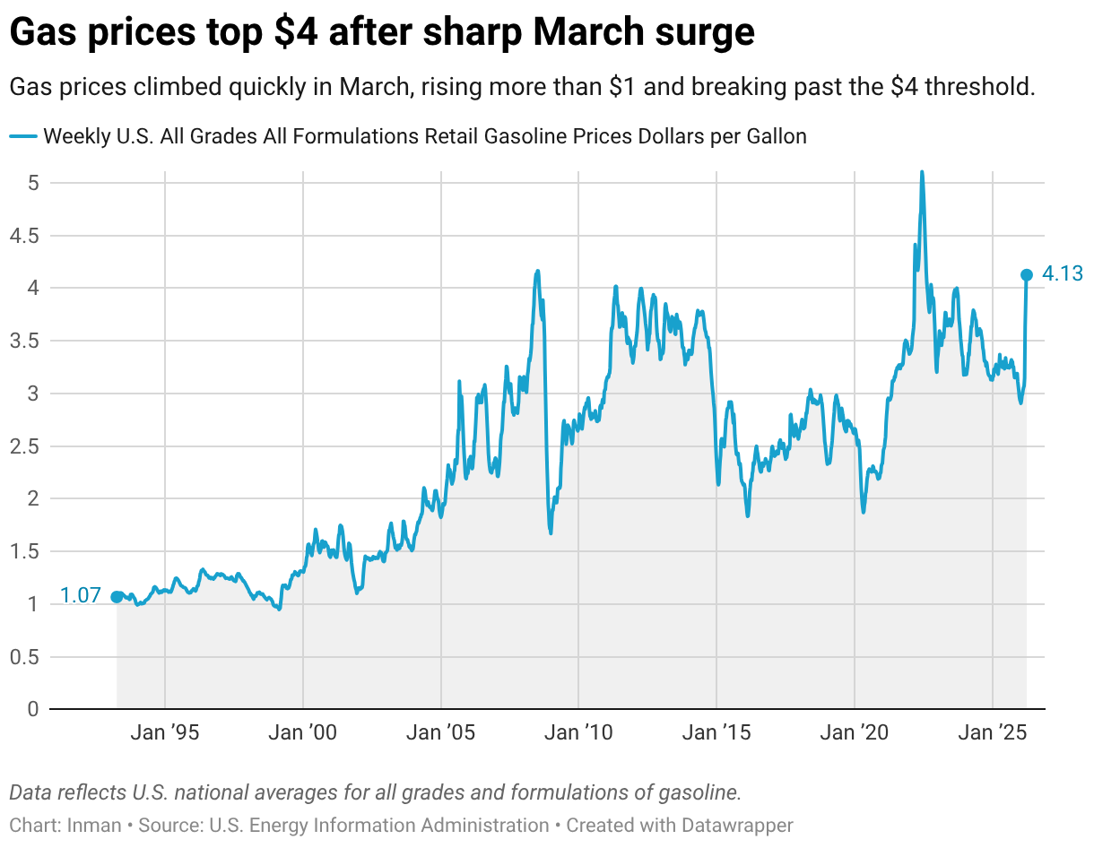 Gas prices climbed quickly in March, rising more than $1 and breaking past the $4 threshold.