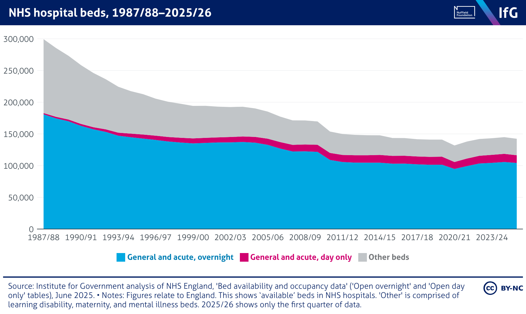 A stacked area chart from the Institute for Government showing the number of NHS hospital beds in England from 1987/88 to 2024/25. The total number of available beds has fallen from almost 300,000 in 1987/88 to around 145,000 in 2024/25, driven largely by the decline in ‘other beds’ (for mental health, maternity and learning disability care), which fell from over 116,000 to around 26,000. General and acute overnight beds decreased from about 181,000 to 106,000, while day-only beds increased from roughly 2,000 to 13,000.