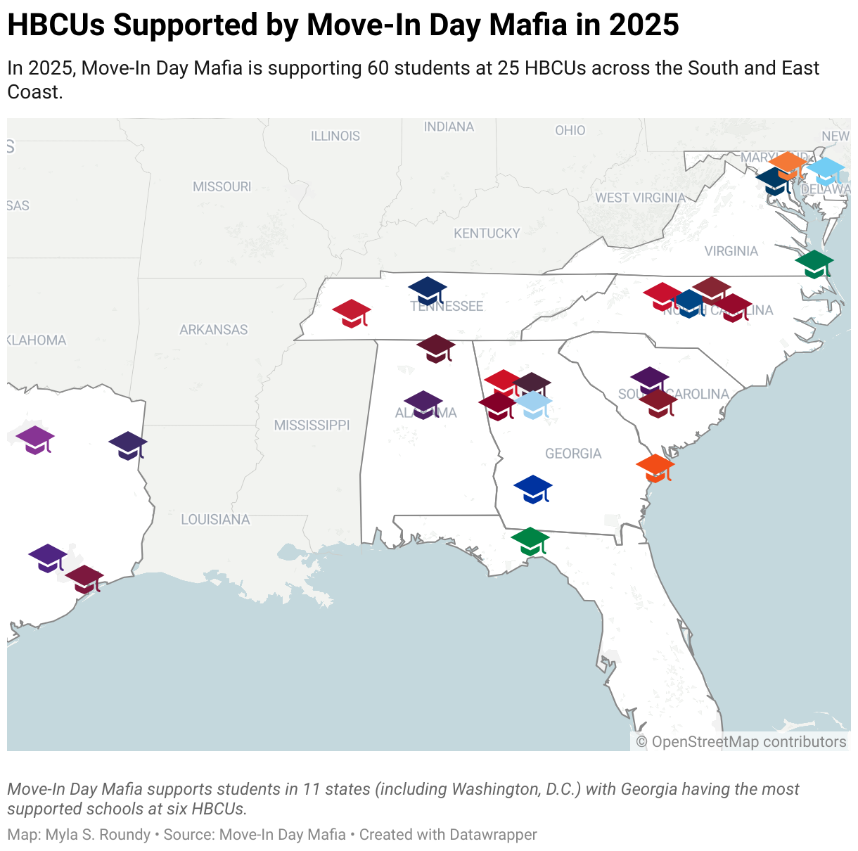 In 2025, Move-In Day Mafia is supporting 60 students at 25 HBCUs across the South and East Coast.