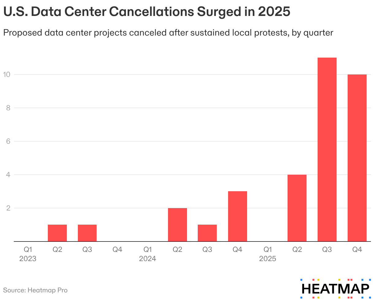 Proposed data center projects canceled after sustained local protests, by quarter